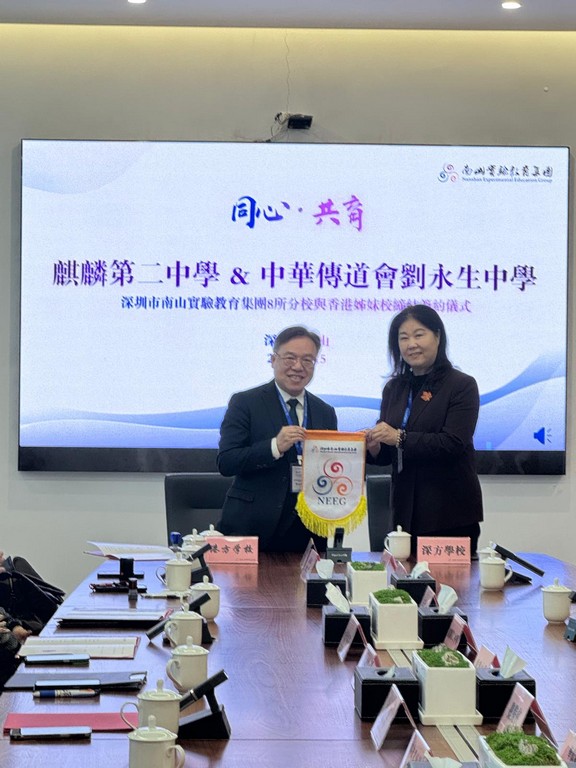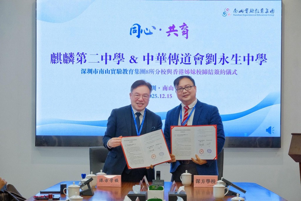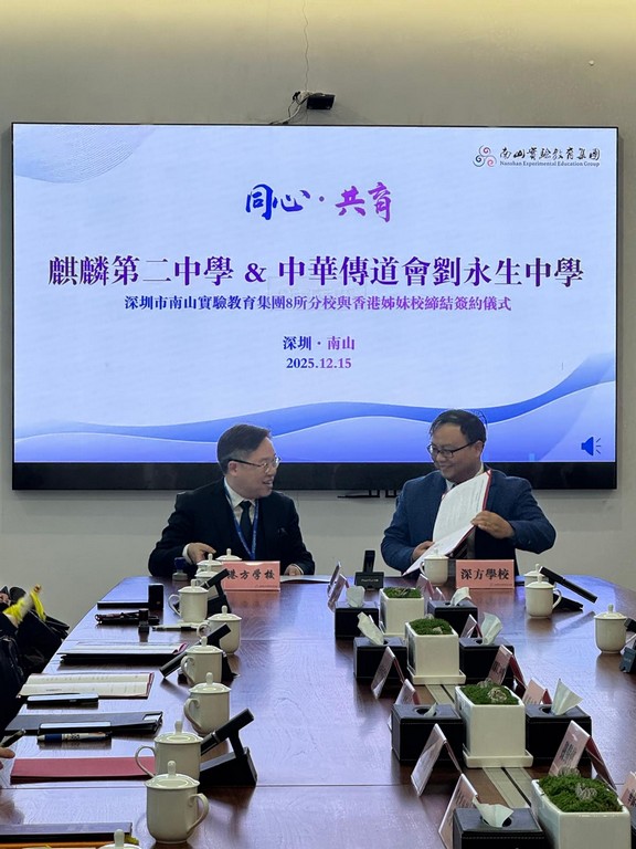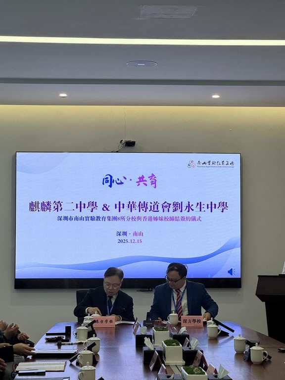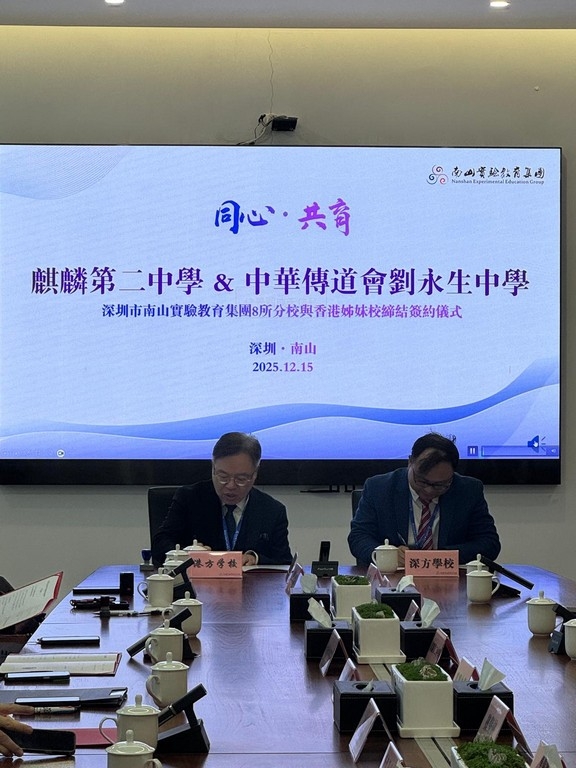 2025年12 月 15 日,梅志業校長親赴深圳,代表本校與深圳麒麟中學簽約締結姊妹學校,開啟深港教育交流新里程。兩校將推動師生互訪、課程共建,共享優質教育資源。